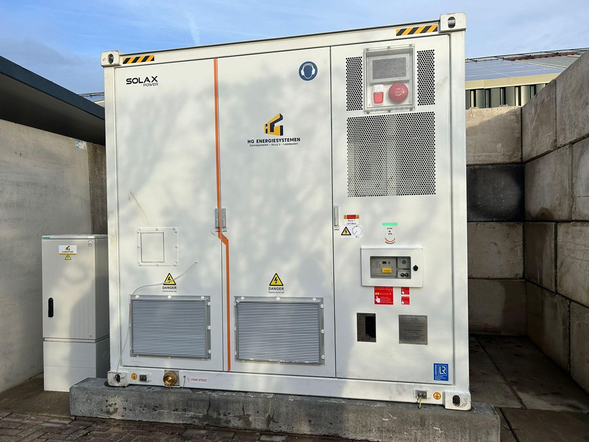 Als u aan accu’s of batterijen denkt, kunt u het gevoel hebben dat dit ook gevaarlijke situaties kan opleveren. De cellen waar HG Energiesystemen gebruik van maakt zijn de meest veilige die er zijn. Het zijn zogeheten lithium ijzerfosfaat cellen (LFP: LiFePO4). Deze cellen hebben 100% van hun capaciteit beschikbaar en zijn dankzij snelle laad- en ontlaadstromen uitstekend geschikt zijn voor energieopslag. De veiligheid in de energieopslagsystemen zijn geborgd door sensoren voor temperatuurbewaking, of de deur geopend of gesloten is en voor het opmerken van brandbaar gas en water. Op het moment dat het nodig is, grijpt het systeem in door afschalen of uitschakeling. Mocht er een externe factor zijn waardoor bijvoorbeeld brand ontstaat, dan zitten er brandblusinstallaties in die voor 1,5 uur kunnen blussen. Daarnaast kunt u kiezen voor een lucht of vloeistof gekoeld energieopslagsysteem.